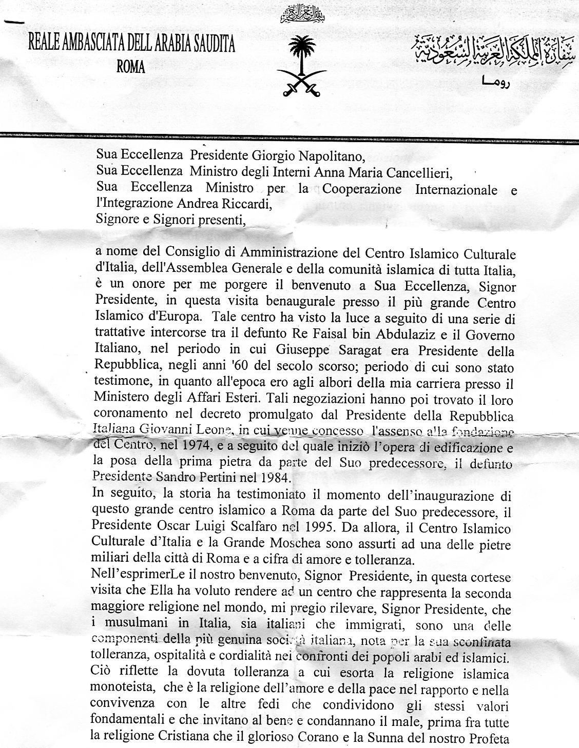 IN ESCLUSIVA Leggi il discorso dell'Ambasciatore dell'Arabia Saudita:
