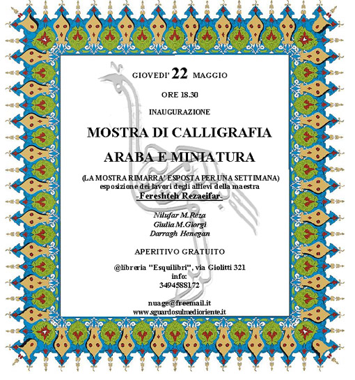 Torneremo a Settembre con nuove iniziative a Roma riguardanti medio oriente e mondo arabo che troverete come sempre nella sezione "eventi". Rimangono valide le informazioni sui "corsi di arabo" sulle quali potete continuare a scrivere alla redazione per ogni delucidazione o prenotazione di ripetizioni per settembre.