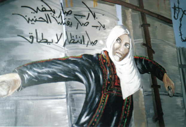 Uno dei dipinti all'interno del centro Ibdaa che rappresentano momenti della storia della Palestina. qui: l'Intifada