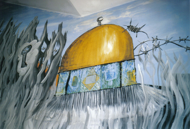 Uno dei dipinti all'interno del centro Ibdaa che rappresentano momenti della storia della Palestina. qui: moschea di Al Aqsa presso Gerusalemme probabilmente in occasione dell'inizio della seconda Intifada il 28 settembre del 2000.